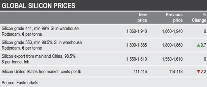 - European grade 553 silicon price ticks up, grade 441 equivalent flat