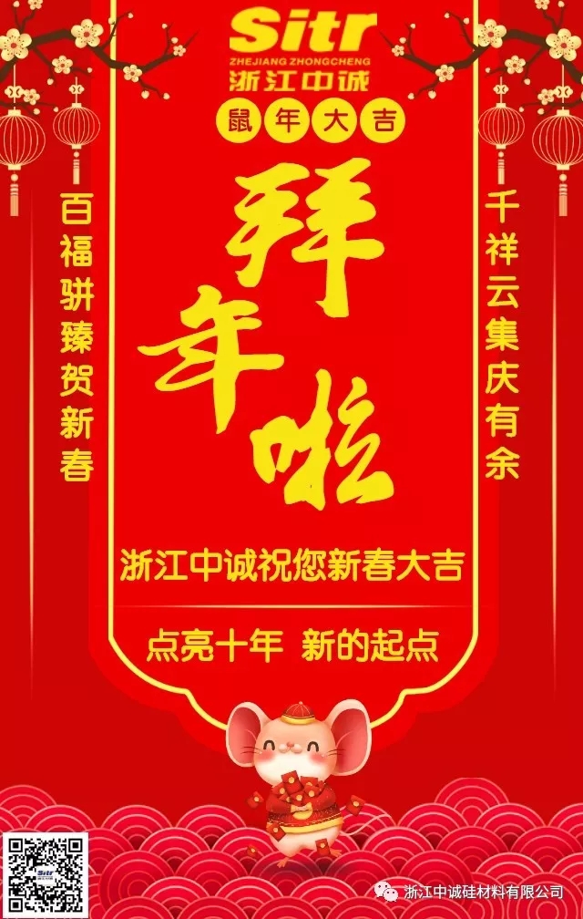 千祥云集庆有余,百福骈臻贺新春!新的一年开启新的希望,新的空白承载新的梦想。浙江中诚硅材料有限公司在2020年将迎来十周年,点亮十年,新的起点!感谢您一直以来的支持关爱,感谢您的鼓励鞭策,感谢您的相伴相随。值此新春之际,浙江中诚硅材料有限公司恭祝大家新春快乐!鼠年大吉!“鼠”您最旺!